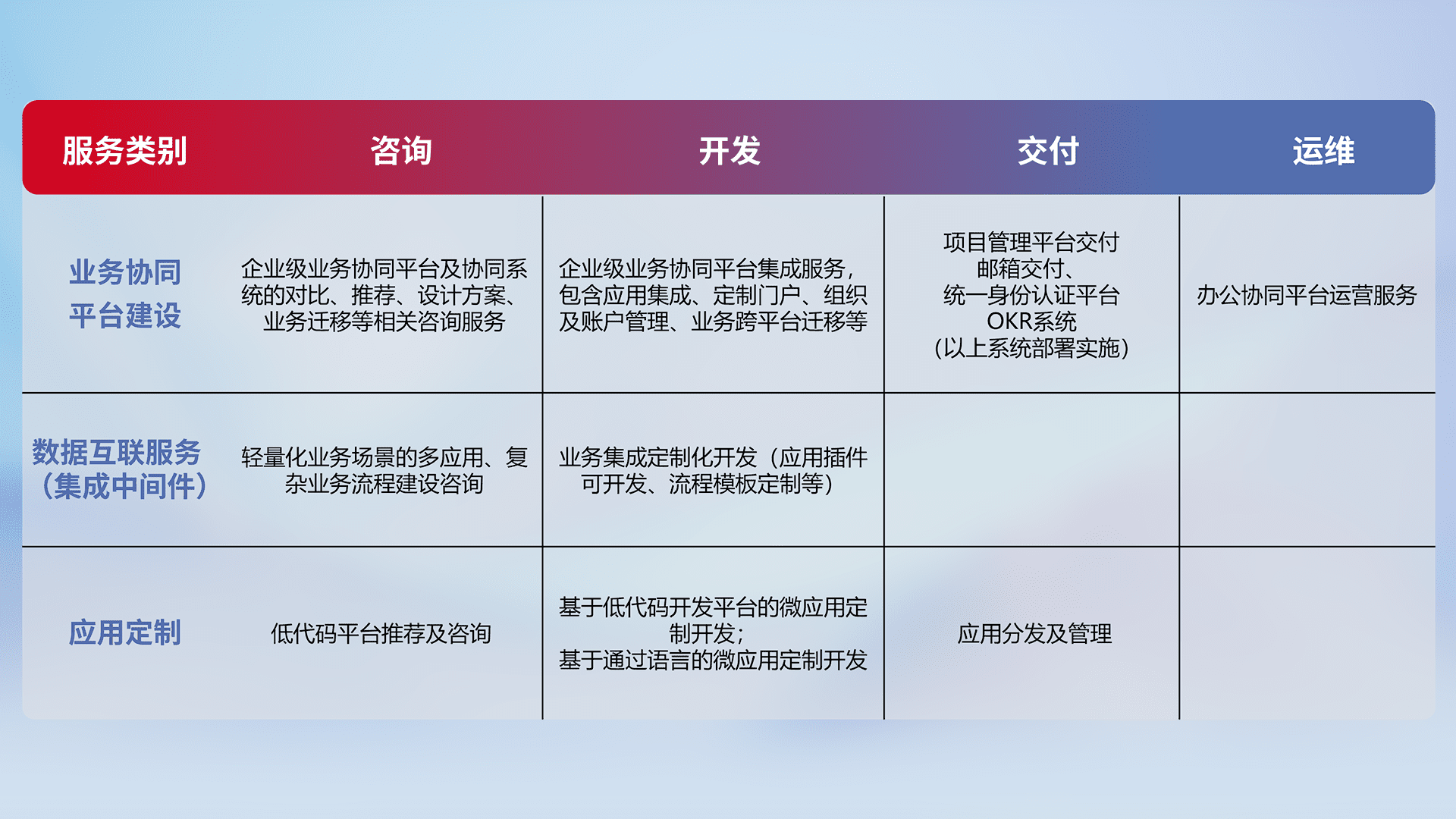 针对钉钉、、企微、、、IDaas等平台级产品提供产品的规划、、、、方案、、交付、、、、定制化开发等服务,,,,实现如统一协同办公、、、智能客户服务、、、、混合会议管理、、智能数据查询、、、等业务场景,,,实现数字化转型。。。。